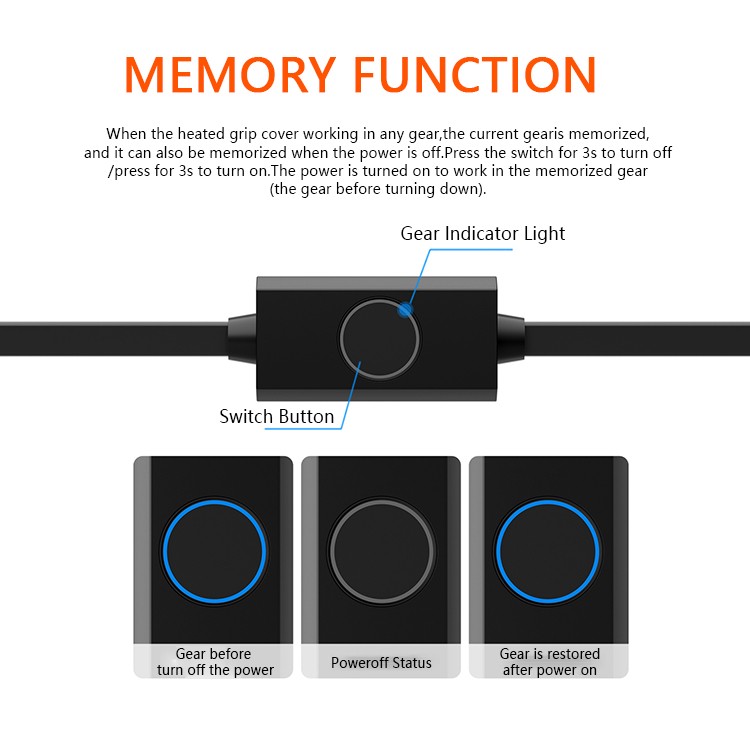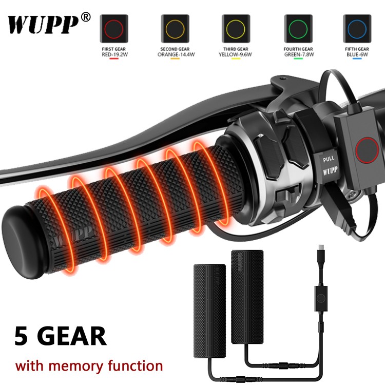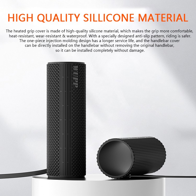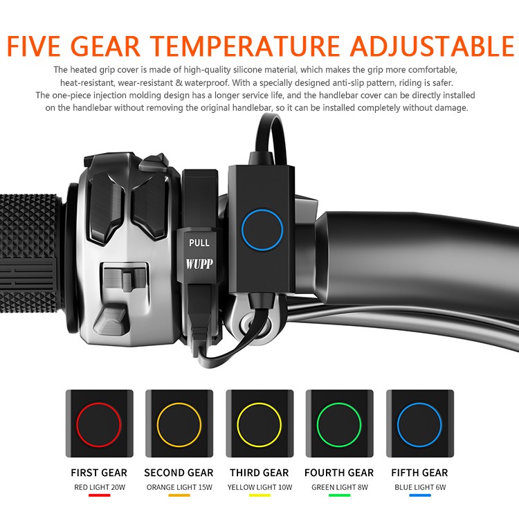 Product Advantages: 1. The product switch is equipped with an intelligent temperature control chip, which can adjust temperature in five levels. Intelligent temperature control is more convenient and can be adjusted to the corresponding temperature according to personal preferences 2. The product switch has added a memory function. After adjustment, it can be turned off and turned on at any time to maintain the optimal temperature of the previous adjustment, which is more considerate and convenient 3. The overall product adopts IP66 waterproof design, even if the handle is soaked in water, there is no problem. The waterproof performance is very good, and it does not affect use even on rainy days 4. The product adopts an integrated molding design and can be directly installed on the original handlebar without disassembling it, making installation simple and efficient 5. Innovative dual outlet switch, smaller and lighter in size, more sensitive and quick to touch, stylish and simple in appearance, can be directly plugged into the C port of the charger for easy and fast operation 6. The heating efficiency of the handle cover has been upgraded on the basis of the previous one. Under the same power and external environment, the heating speed and final temperature are the best among the same class, even comparable to the heating temperature of the electric handle 7. Upgraded the silicone material and texture design of the product, which is more wear-resistant, has a longer lifespan, has greater friction, a softer and more comfortable hand feel, a heating area that better meets the needs of warmth, and a more comfortable palm feel